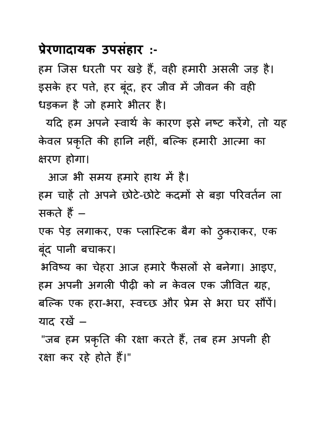 | अति संक्षेप शोध सारांश | मानव जीवन का अस्तित्व प्रकृति पर निर्भर है। जल, वायु, भूमि, वनस्पति और जीव-जंतु हमारे जीवन के मूल आधार हैं। औद्योगिक विकास और अंधाधुंध शहरीकरण ने प्राकृतिक संतुलन को प्रभावित किया है, जिससे वनों की कटाई, जल और वायु प्रदूषण, जलवायु परिवर्तन और जैव विविधता का ह्रास हुआ है। भारतीय संस्कृति में प्रकृति को माता का दर्जा दिया गया है और पारंपरिक ज्ञान में पर्यावरण संरक्षण का गहरा संदेश निहित है। प्राचीन और मध्यकालीन भारत में वन्यजीव, जल और भूमि संरक्षण के लिए सामाजिक और कानूनी व्यवस्थाएँ थीं। स्वतंत्रता संग्राम के दौरान भी पर्यावरण और संसाधनों के संयमित उपयोग पर बल दिया गया। आज आवश्यक है कि व्यक्तिगत और सामुदायिक स्तर पर वृक्षारोपण, जल संरक्षण, प्लास्टिक उपयोग में कमी, अक्षय ऊर्जा और जैविक खेती जैसे उपाय अपनाए जाएँ। शोधार्थी ने व्यक्तिगत रूप से 500 से अधिक वृक्ष लगाकर और ‘माई हॉफ ट्री’ संस्था के सहयोग से समाज में पर्यावरण जागरूकता बढ़ाई। प्रकृति और मानवता का संबंध सहजीवी है; एक के बिना दूसरा टिक नहीं सकता। यह शोध इस महत्वपूर्ण संबंध को उजागर करते हुए सतत संरक्षण और मानवता की जिम्मेदारी का संदेश देता है।\r\n\r\n |