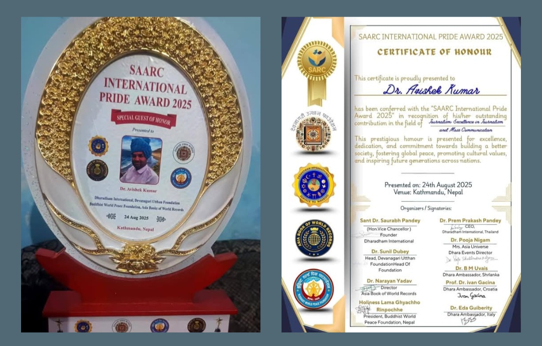 धरधाम अंतर्राष्ट्रीय के द्वारा नेपाल के राजधानी काठमांडू में दिनांक 24 अगस्त 2025 को आयोजित SARC अंतर्राष्ट्रीय गौरव सम्मान समारोह में नेपाल के प्रथम उपराष्ट्रपति व न्यायमूर्ति श्री परमानंद झा, उप प्रधानमंत्री तथा सौहार्द शिरोमणि डॉ सौरभ पाण्डेय जी के हाथों सुविख्यात साहित्यकार डॉ अभिषेक कुमार को SARC अंतर्राष्ट्रीय गौरव सम्मान से सम्मानित किया गया।