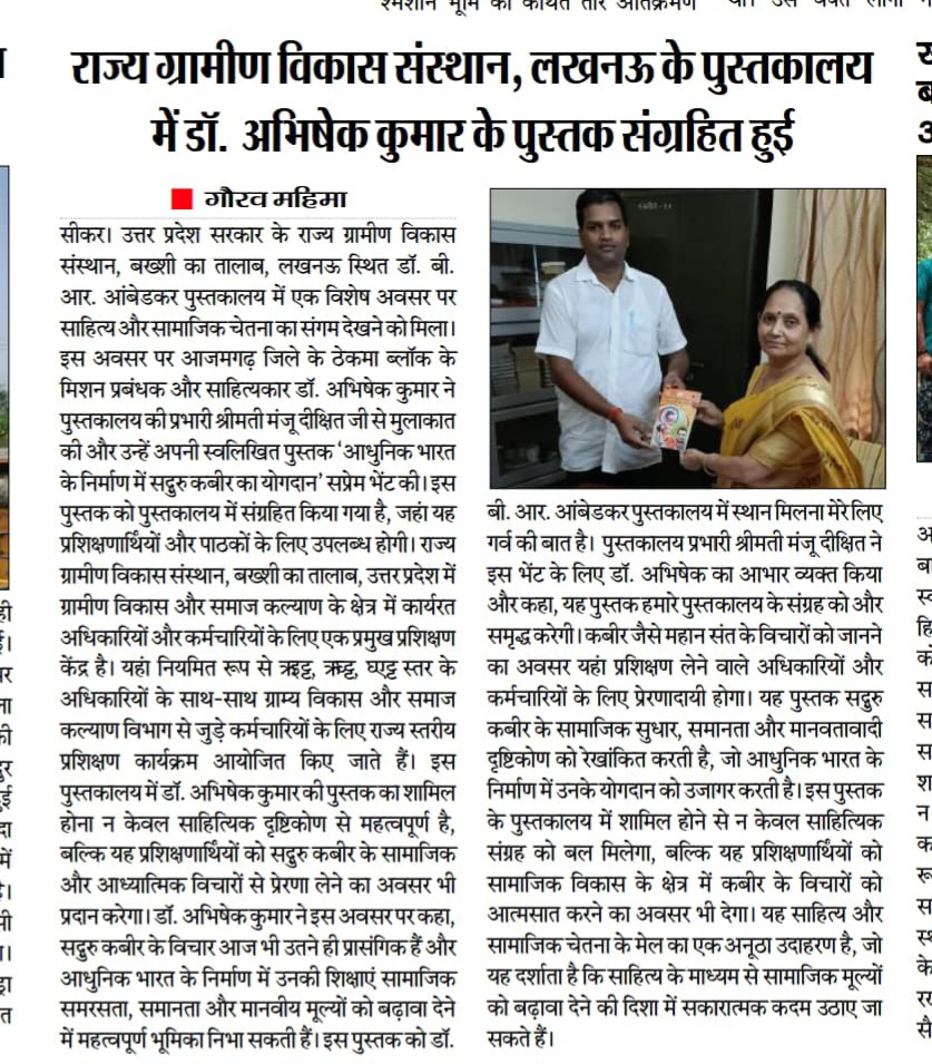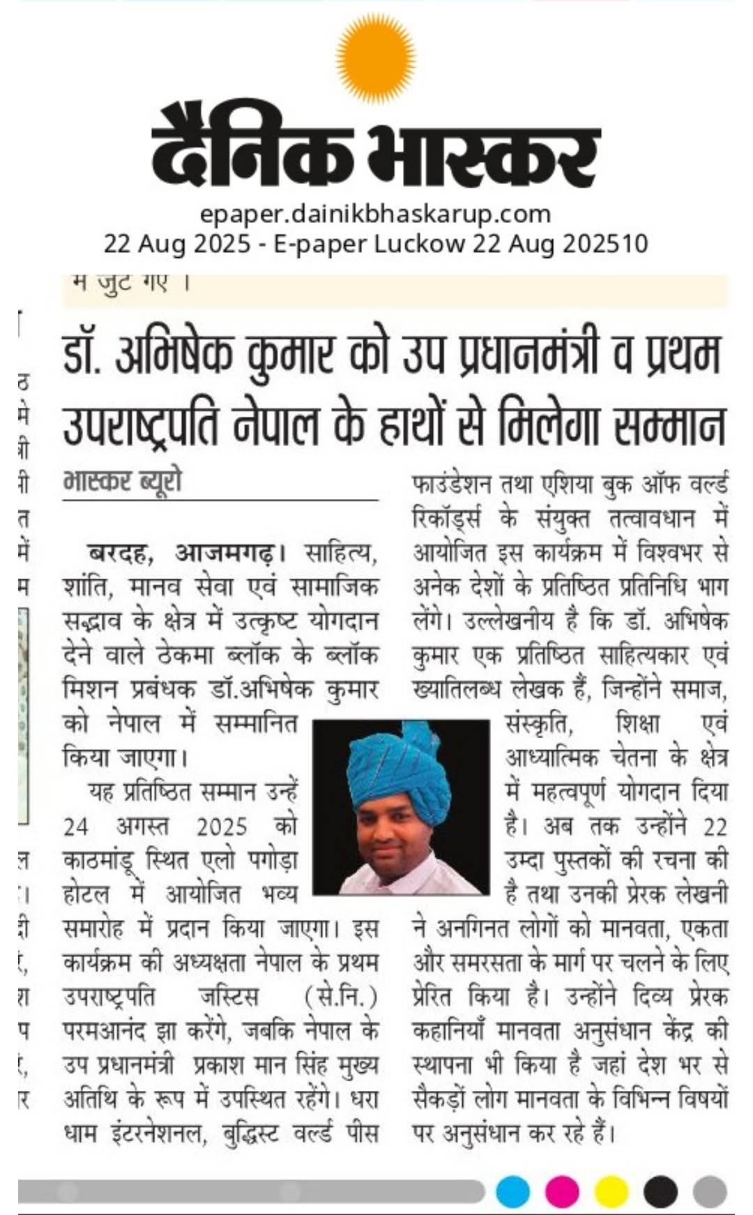 इस उच्च मंजिल की ओर अग्रसर रथ के सारथी डॉ. अभिषेक कुमार बेशक साधुवाद के पात्र हैं। वे न केवल युवा, जिज्ञासु, जुनूनी और जानकार हैं, बल्कि मानवता के पताका को अखिल विश्व में फहराने के लिए नित्य युद्धरत हैं। प्रबल विश्वास है कि ऐसे आध्यात्मिक सारथी के होते, मंजिल कठिन नहीं होगा।